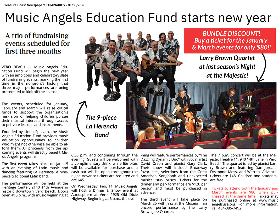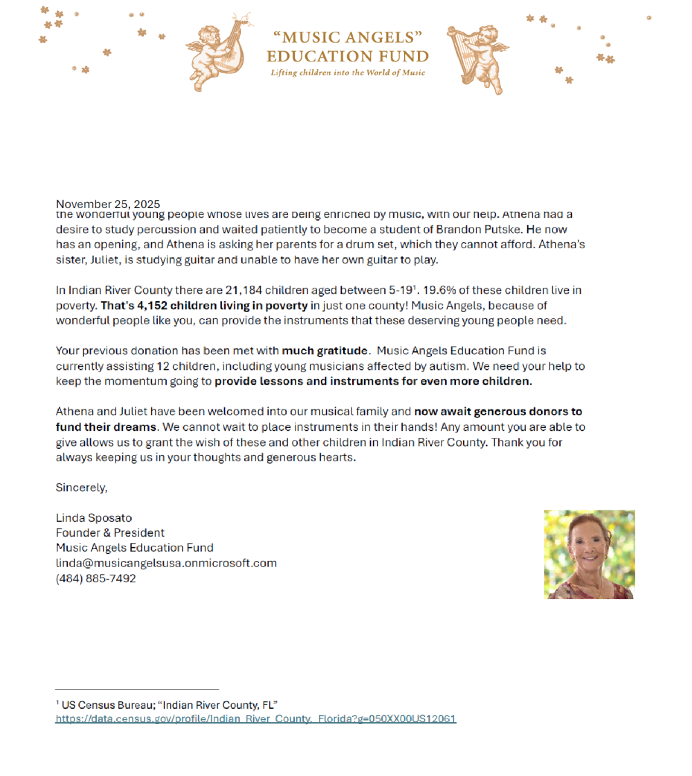 The Music Angels Education Fund is a 501(C) (3) Florida nonprofit, corporation.